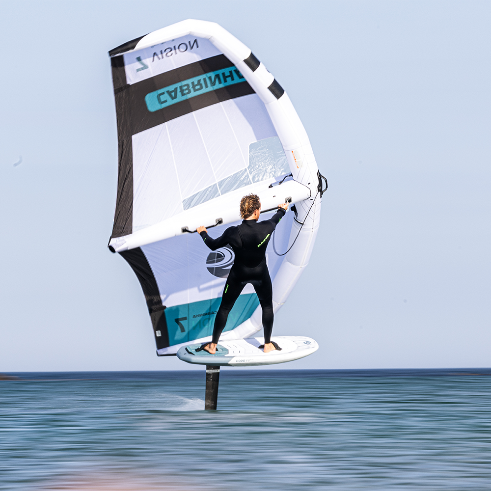 A complete wing foiling package with the Cabrinha Vision wing, board, and the H-Series 800 foil kit with V-Series 180 tail
